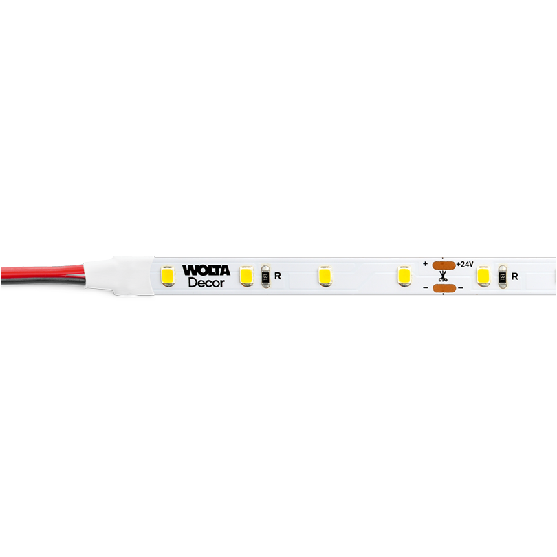 Декоративная светодиодная лента WOLTA®Decor cерии WLS представляет собой современный LED-модуль на гибкой печатной (монтажной) плате, на которой равноудалённо друг от друга расположены мощные светодиоды. Ширина ленты составляет 8-10 миллиметров (в зависимости от модели), а ее толщина со светодиодами 1-2 миллиметра. При изготовлении лента сматывается в катушку длиной 5 метров. Для ограничения подачи тока через наши светодиоды в электрическую схему WLS введены балластные сопротивления (резисторы), которые размещены на самой ленте.